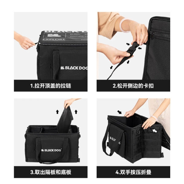 The BLACKDOG CBD2450XB016 51L Tactical Storage Bag is a large, collapsible camping and outdoor gear bag designed for organized, portable storage. The product is also known as the "Jiye CW Tactical Pack" and is made from durable Oxford cloth. It is designed with tactical features, such as multiple compartments and side pockets, to keep items easily accessible and organized.