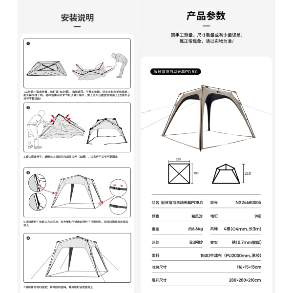 - Dimensions: The Holiday Dome Automatic Shelter PO8.0 model has an expanded size of 280x280x210 cm and weighs about 6.6 kg.