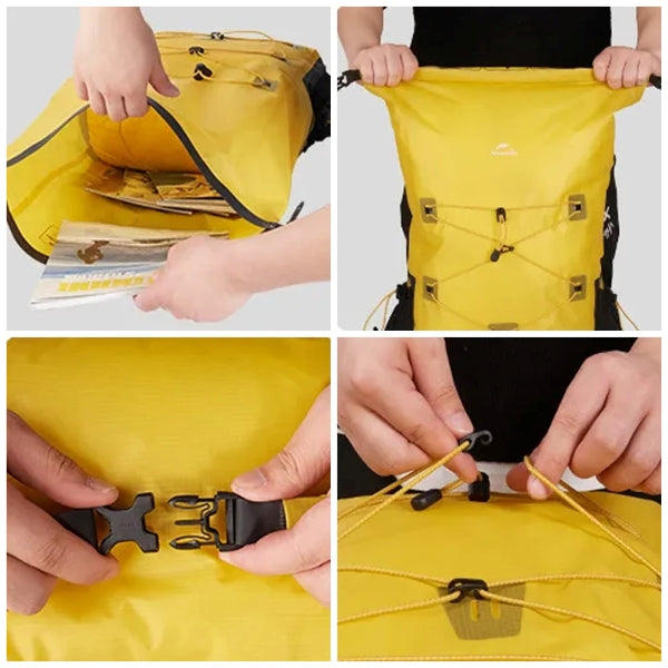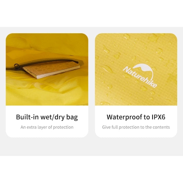Naturehike Lightweight Sports Waterproof Bag is an outdoor backpack designed for hiking, camping, and water sports. It has a capacity of 25L and weighs approximately 430g. The backpack is made from 70D plaid laminated cloth, which gives it an IPX6 waterproof rating, meaning it can withstand powerful jets of water but is not designed for full submersion.