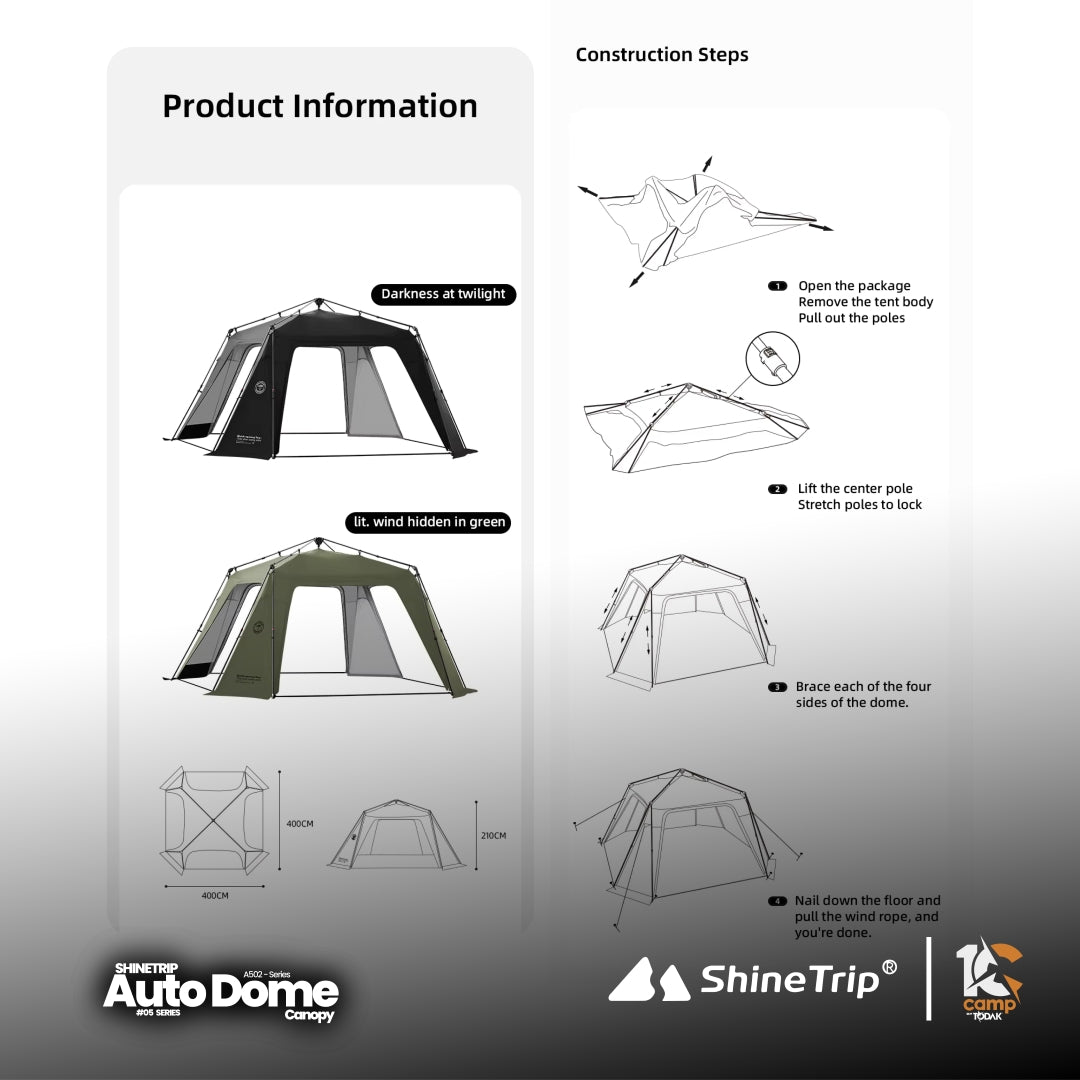 1.Enjoy the convenience of setting up the ShineTrip Auto Dome Canopy in just one minute, thanks to its pole-free quick setup feature.